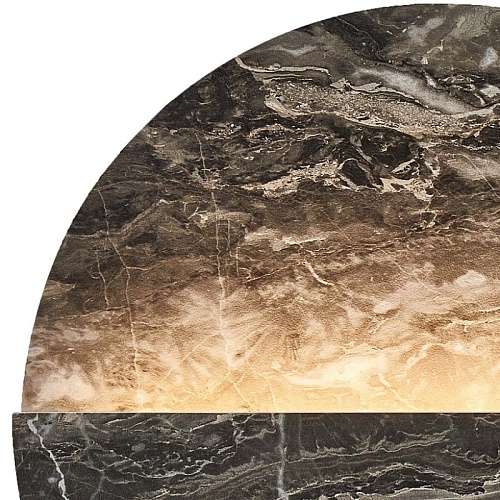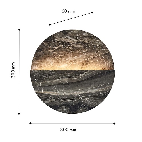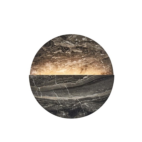 Каркас из металла черного матового цвета, декоративный элемент из двух половинок диска из искусственного мрамора (керамогранита) в цвете серый мрамор, LED-модуль с рассеивателем из акрила белого цвета.