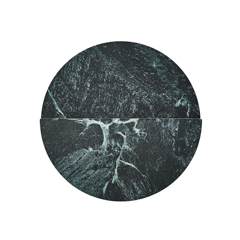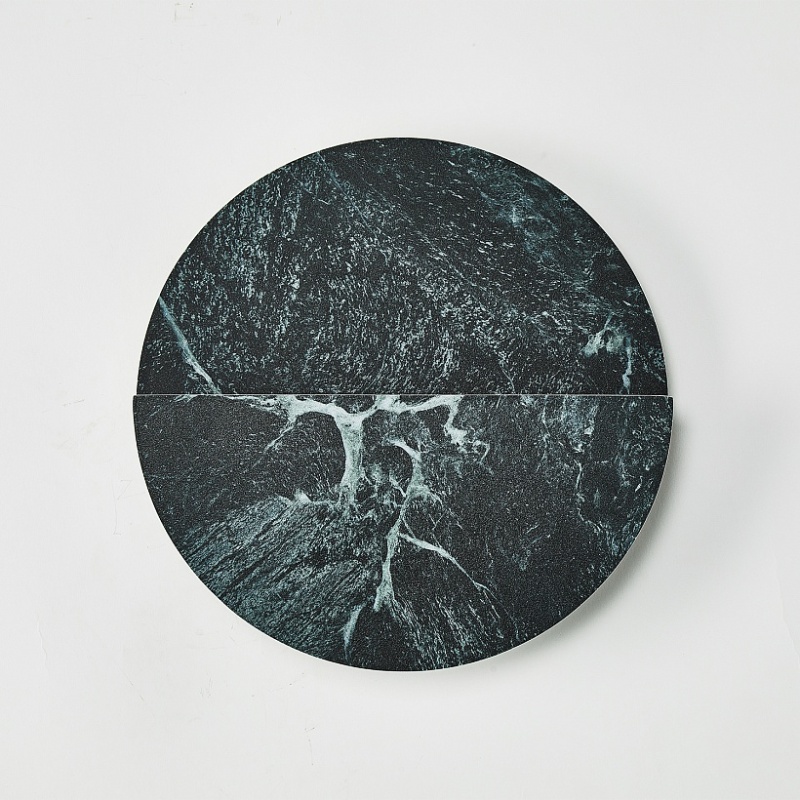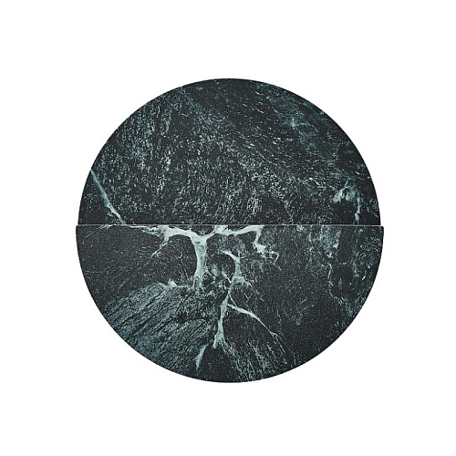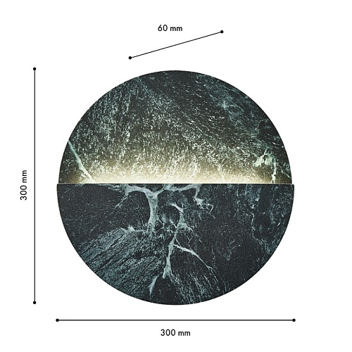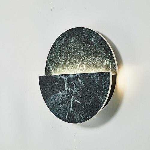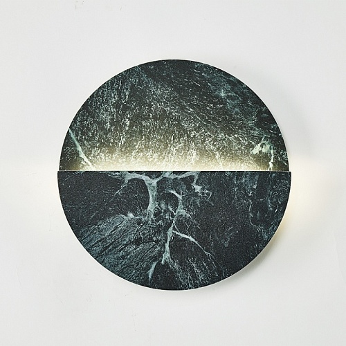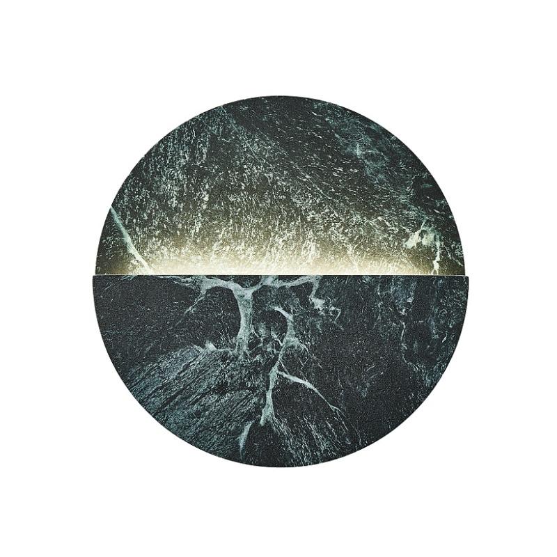 Каркас из металла черного матового цвета, декоративный элемент из двух половинок диска из искусственного мрамора (керамогранита) в цвете зеленый мрамор, LED-модуль с рассеивателем из акрила белого цвета.