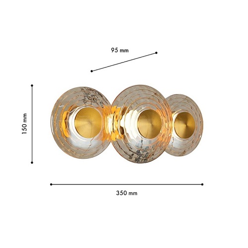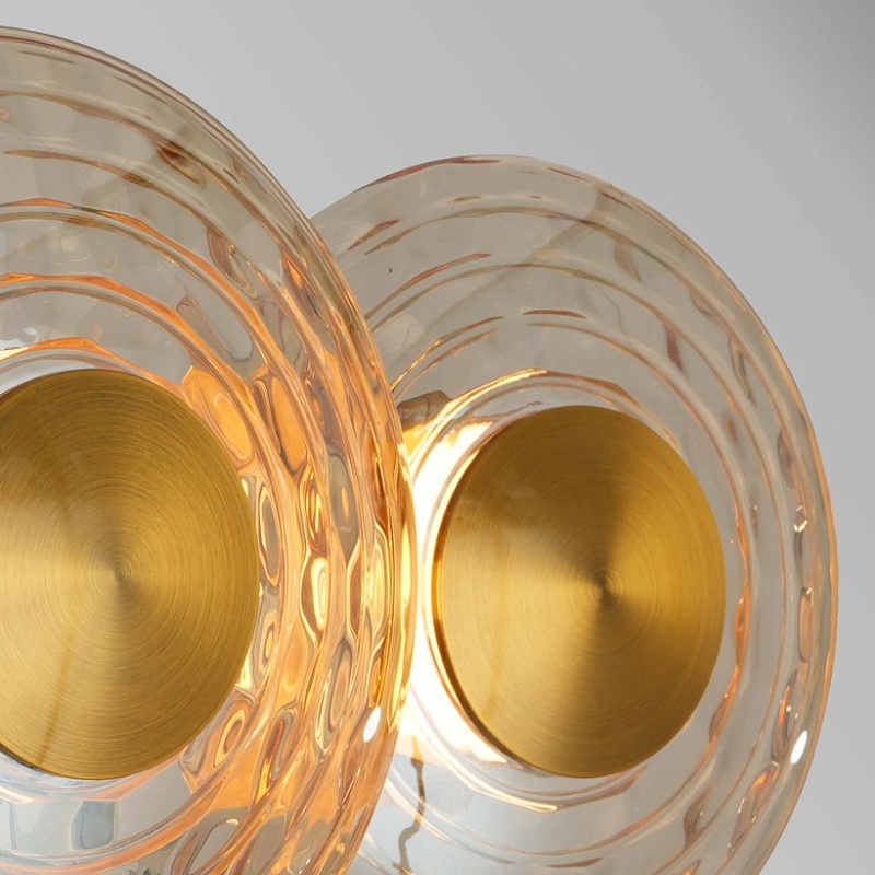 Металлический каркас цвета латунь, закругленные фактурные плафоны из стекла янтарного цвета, LED-модуль.