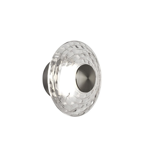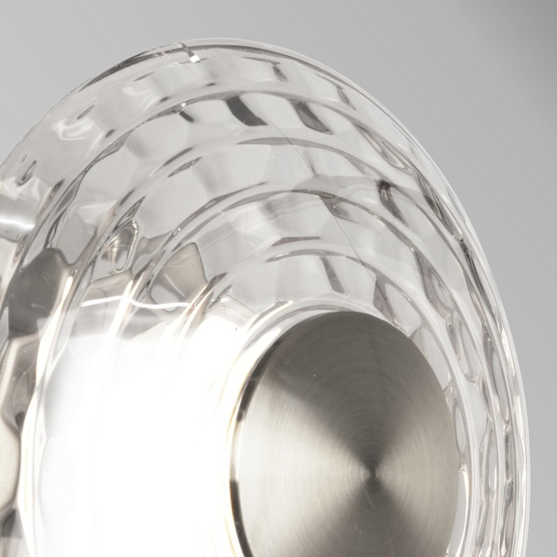Металлический каркас цвета матовый никель, закругленный фактурный плафон из прозрачного стекла, LED-модуль.
