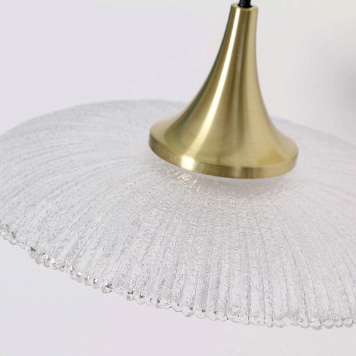 Металлический каркас золотого матового цвета с гальваническим покрытием, плафон из прозрачного стекла с волнистым эффектом, LED-модуль.