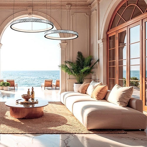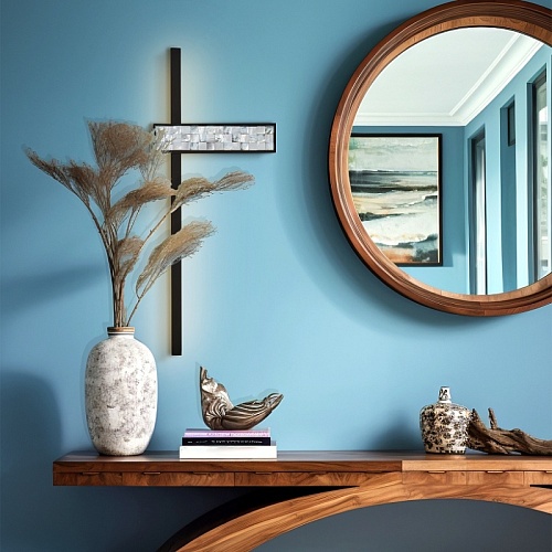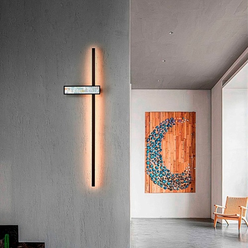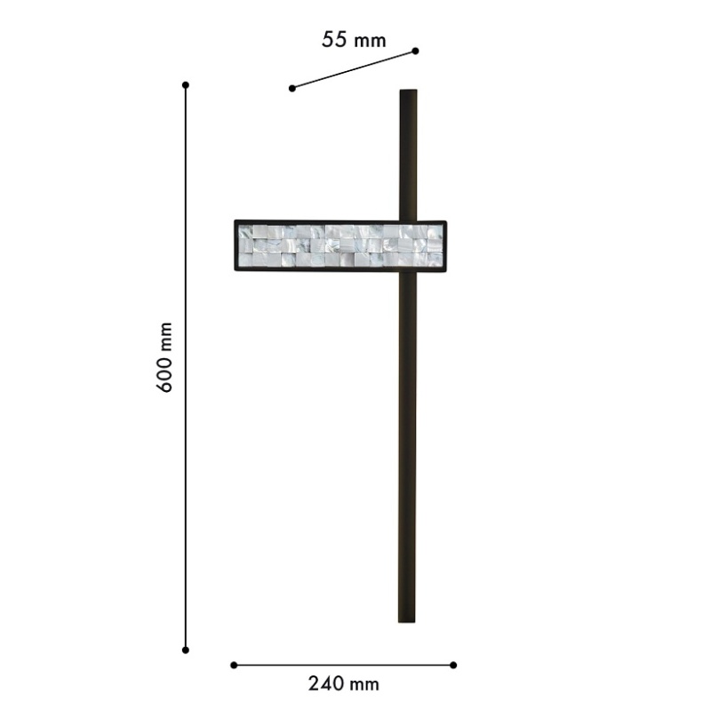 Металлический каркас черного цвета, LED-лента на внутренней стороне, декоративный элемент из перламутровых квадратиков из морских ракушек.