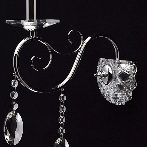Основание бра: металл, гальванизировано в цвет хрома. Рожок и декоративный элемент выполнены по технологии проката на роликовом станке. Декоративная розетка выполнена из массива хрусталя. Основание закрыто декоративной розеткой , выполненной из стекла, отлитого в сложную форму. Светильник декорирован подвесками из хрусталя высокого качества формы октагон и овал.