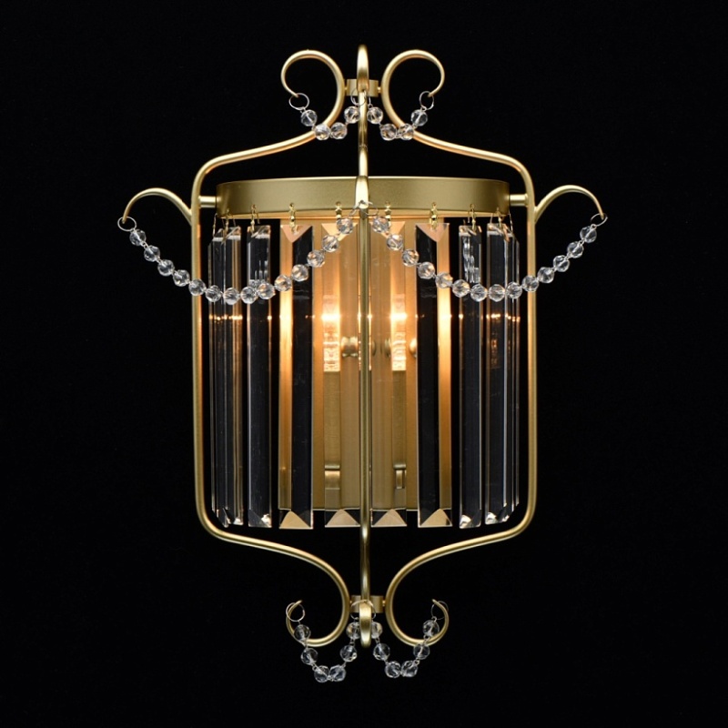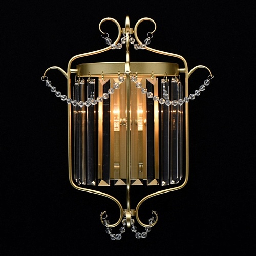 Основание светильника выполнено из металла и окрашено в цвет перламутрового золота. Светильник декорирован прозрачным хрусталем прямоугольной формы.
