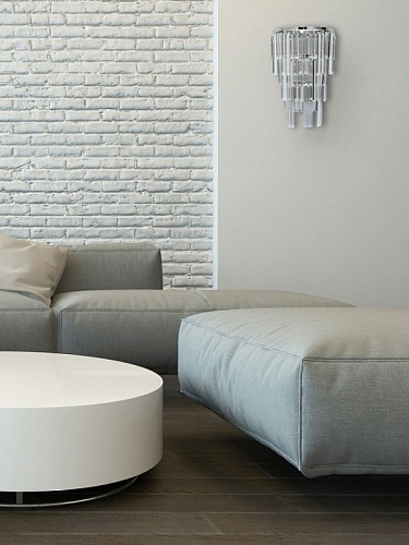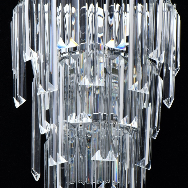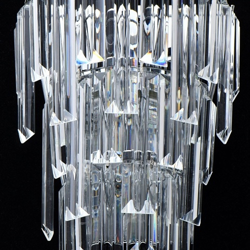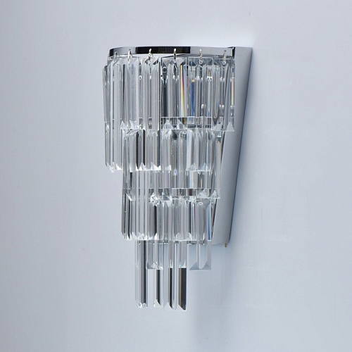 Основание светильника выполнено из металла и гальванизировано в цвет хрома. Светильник декорирован прозрачным хрусталем прямоугольной формы.
