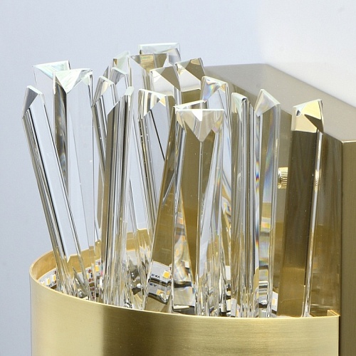Основание выполнено из нержавеющей стали отполированной до зеркального блеска и металла, гальванизированного в цвет латуни.Декор - прозрачный хрусталь прямоугольной формы.