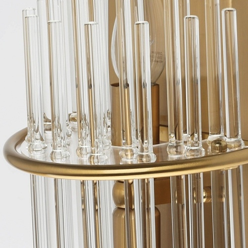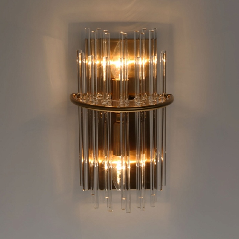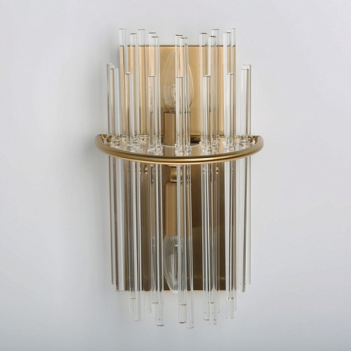 Металлическое основание настенного бра гальванизировано в цвет золота. Светильник декорирован прозрачным стеклом в виде трубочек. Стеклянный декор крепится на пластину из нержавеющей стали, отполированной до зеркального блеска.