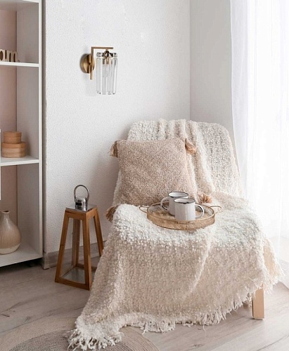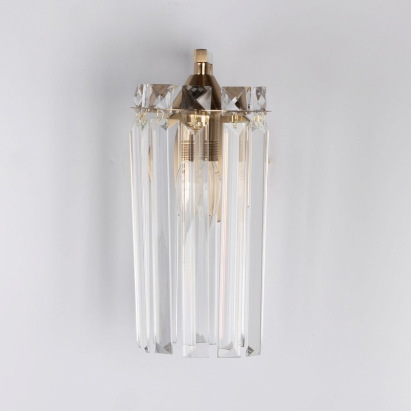 Металлическое основание настенного бра гальванизировано в цвет латуни. Светильник декорирован подвесками из прозрачного хрусталя вытянутой формы.