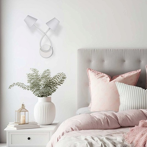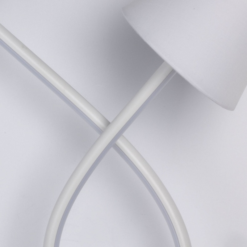 Металлическое основание настенного бра окрашено в белый цвет. Корпус плафонов изогнутой формы выполнен из сплава алюминия с цинком и окрашен в цвет основания. Двухслойные абажуры состоят из текстиля белого цвета и термостойкого акрила с внутренней стороны. Абажуры прошиты. Светодиодные источники света закрыты белым силиконом.