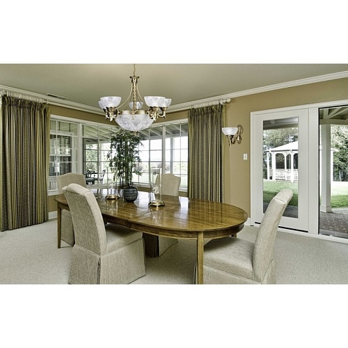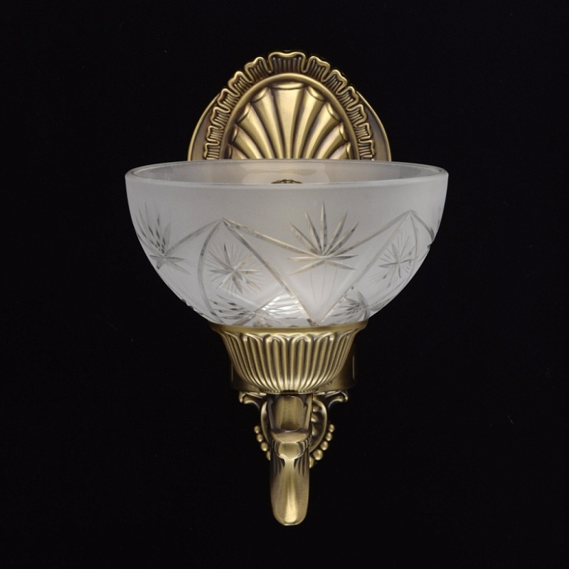 Арматура бра выполнена из сплава алюминия с цинком по технологии художественного литья и гальванизирована в цвет античной бронзы с эффектом патинирования. Плафон изготовлен из прозрачного стекла , обработанного пескоструйным матированием с рисунком нанесенным по технологии алмазной резьбы.