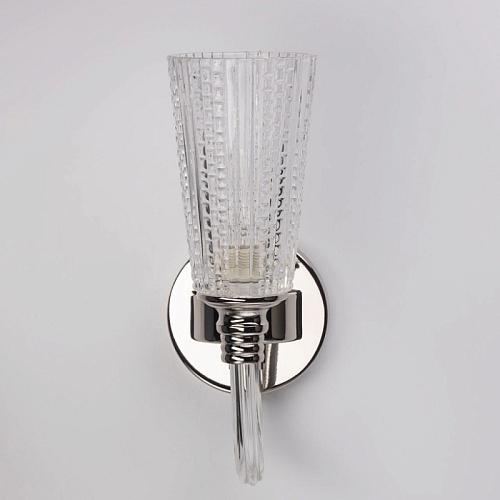 Металлическое основание гальванизировано в цвет хрома. Рожки выдуваются вручную из гутного стекла. Светильник декорирован плафонами из фактурного прозрачного стекла. Центральная ось декорирована массивами хрусталя.