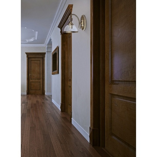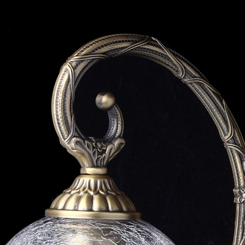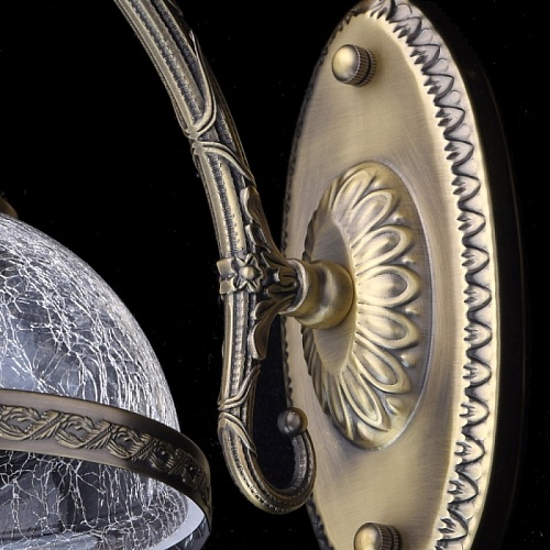 Арматура бра выполнена из комбинации сплавов металлов и гальванизирована в цвет античной бронзы с последующим патинированием. Основание выполнено из сплава железа по технологии прессования. Рожок выполнен из сплава алюминия по технологии художественного литья. Светильник декорирован стеклянным плафоном, отлитым в форму и обработанным по технологии кракелирования. Край плафона декорирован чеканкой на металлической ленте, выполненной из сплава железа.