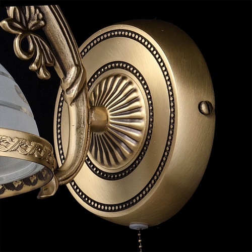 Арматура бра выполнена из латуни с последующим патинированием и покрытием защитным лаком. Рожок изготовлен по технологии художественного литья. Плафон декорирован чеканкой из латуни, также покрытой патиной и защитным лаком. Плафон выполнен из стекла, обработанного пескоструйным матированием, рисунок нанесен алмазной резьбой.