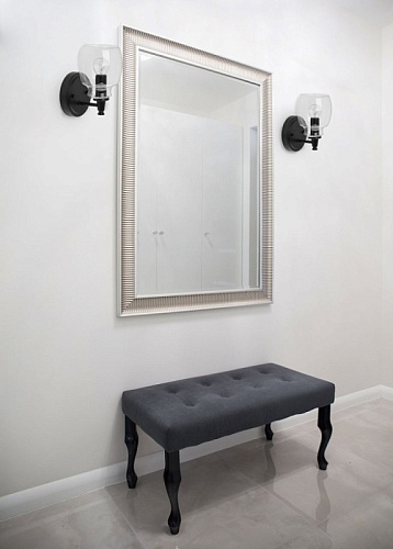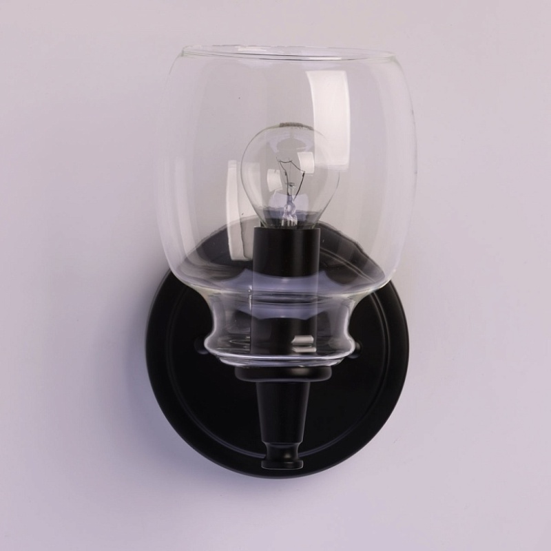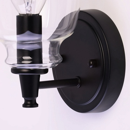 Металлическое основание настенного бра окрашено в черный цвет. Прозрачный стеклянный плафон отлит в сложную форму.