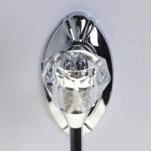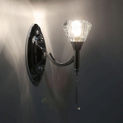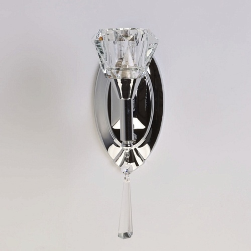 Металлическое основание настенного бра гальванизировано в цвет хрома. Плафон выполнен из прозрачного массива хрусталя. Светильник декорирован хрустальной подвеской вытянутой формы.