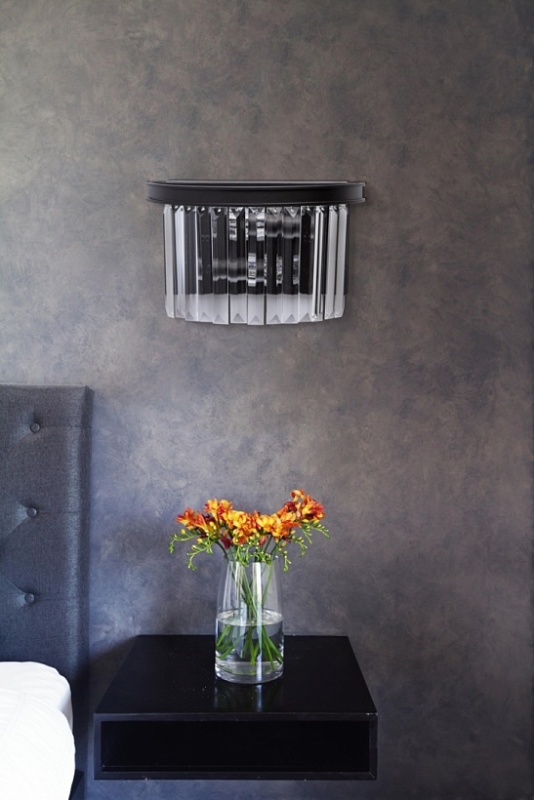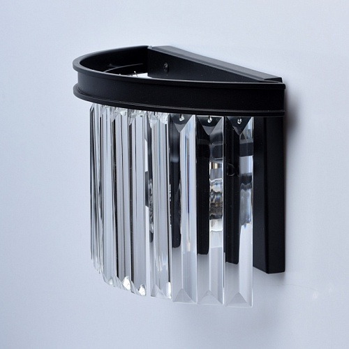 Основание бра выполнено из металла и окрашено в черный матовый цвет. Светильник декорирован прозрачным хрусталем прямоугольной формы.