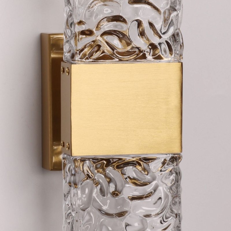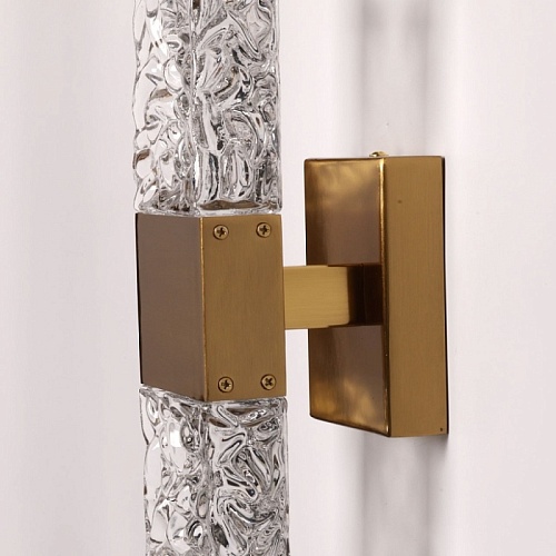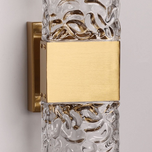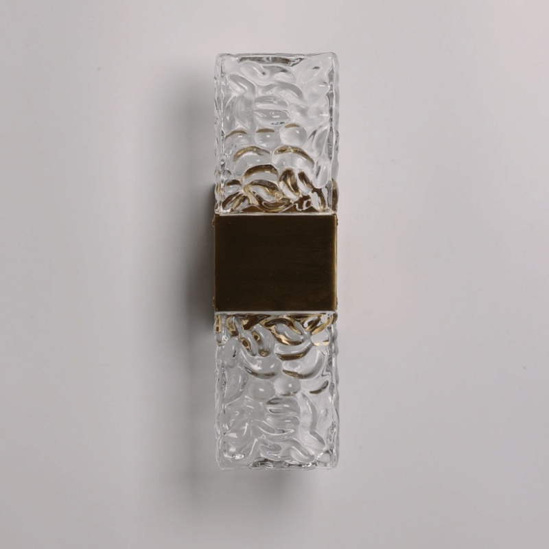 Металлическое основание настенного бра гальванизировано в цвет латуни. Светодиодный источник света закрыт прозрачным фактурным стеклом, отлитым в сложную форму.