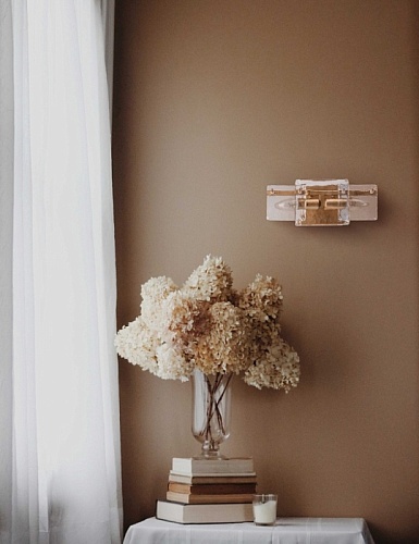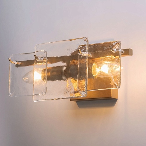 Металлическое основание настенного бра гальванизировано в цвет золота. Горизонтальное бра декорировано плафоном, имитирующим вулканическое стекло