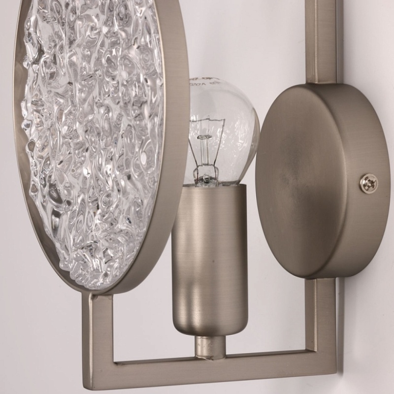 Металлическое основание настенного бра гальванизировано в цвет матового никеля. Декор выполнен из прозрачного фактурного стекла.