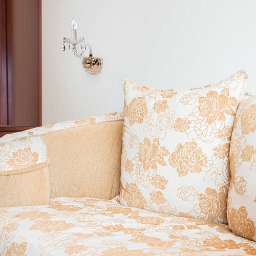 Арматура выполнена из сплава металла и гальванизирована в цвет французского золота. Рожки светильника выполнены из стекла гутным способом. Сверху арматура декорирована прозрачным хрустальным стеклом с градуированной огранкой. Светильник декорирован бусами из хрусталя и хрустальными подвесками 4-х видов огранки.