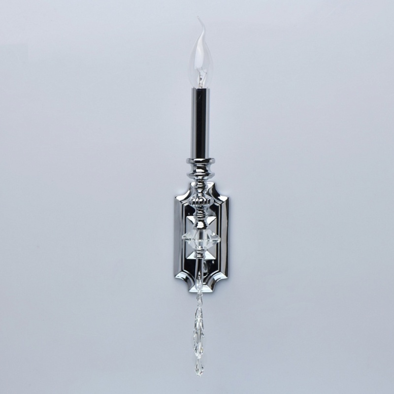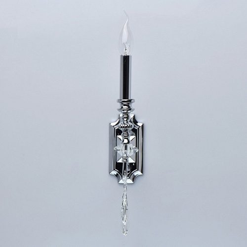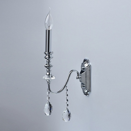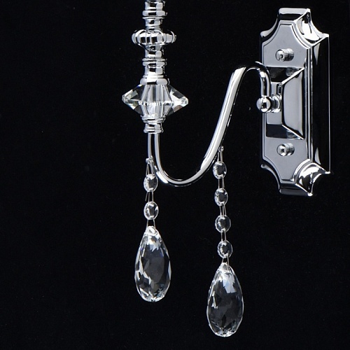 Основание светильника выполнено из металла и гальванизировано в цвет хрома. Светильник декорирован прозрачным хрусталем.