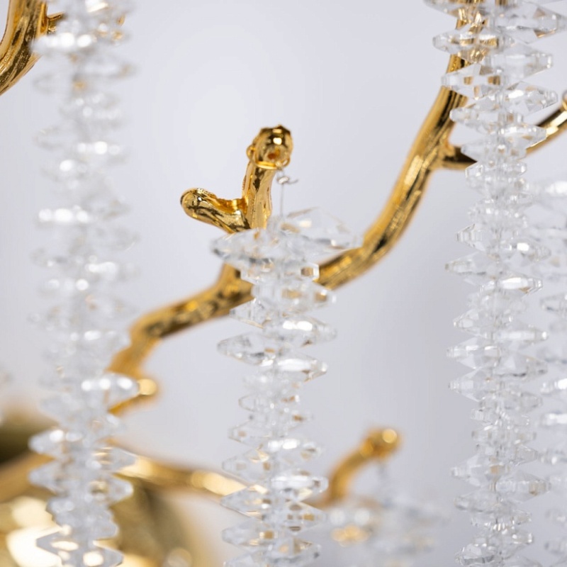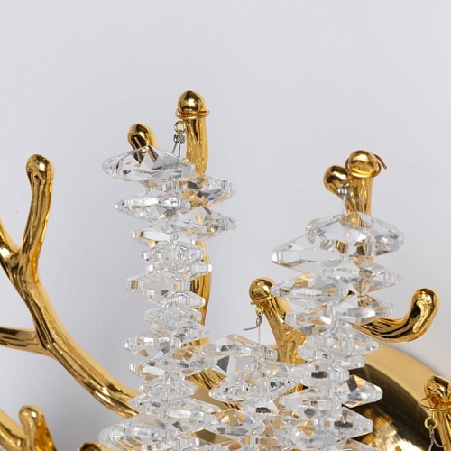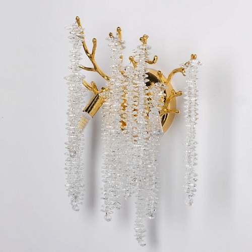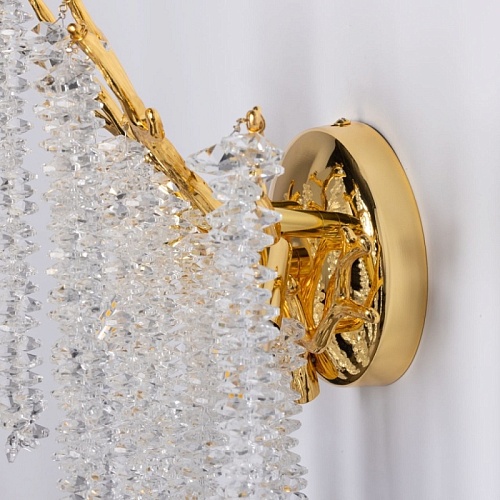 Основание настенного бра выполнено по технологии художественного литья из сплава алюминия с цинком и гальванизировано в цвет золота. Настенное бра декорировано гроздьями из прозрачного хрусталя.