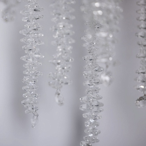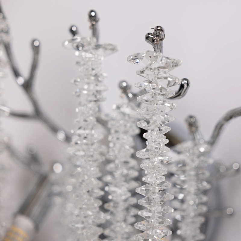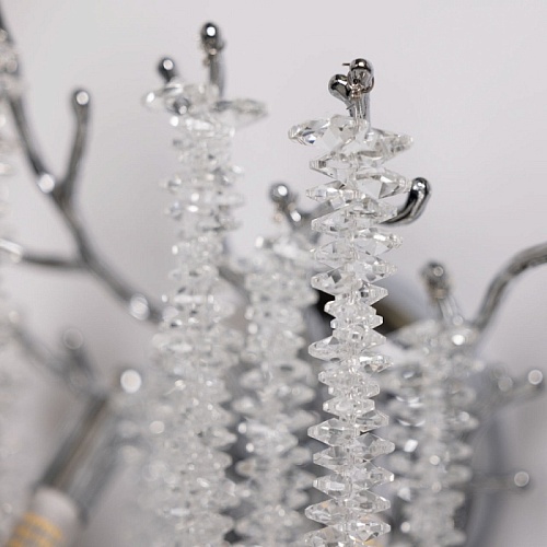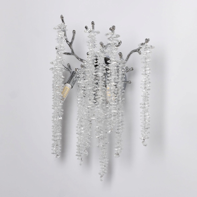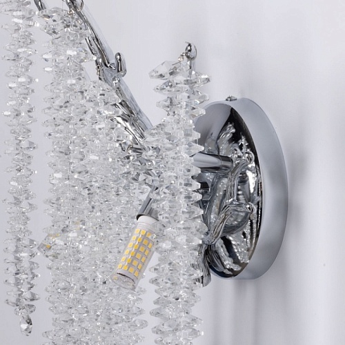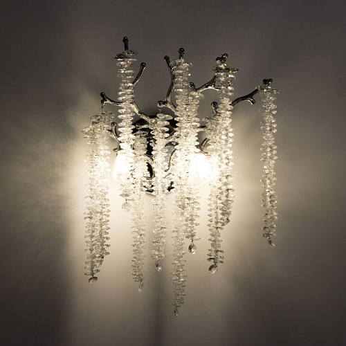 Основание настенного бра выполнено по технологии художественного литья из сплава алюминия с цинком и гальванизировано в цвет хрома. Настенное бра декорировано гроздьями из прозрачного хрусталя.
