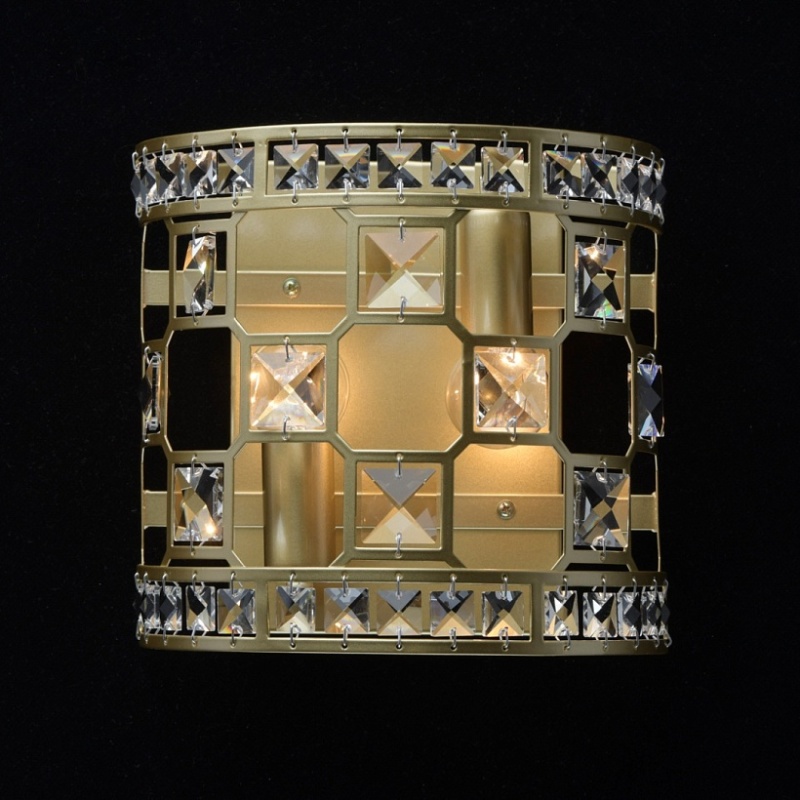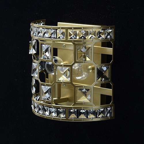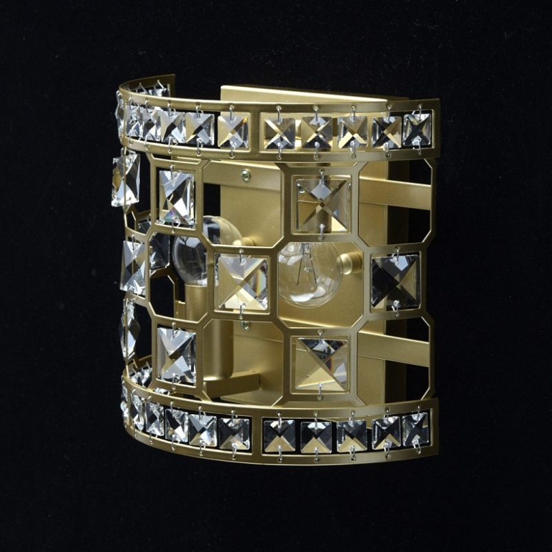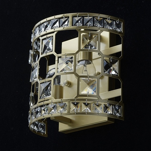 Основание светильника выполнено из металла и окрашено в цвет перламутрового золота. Декоративный плафон выполнен по технологии лазерной резки. Светильник декорирован прозрачным хрусталем квадратной формы.