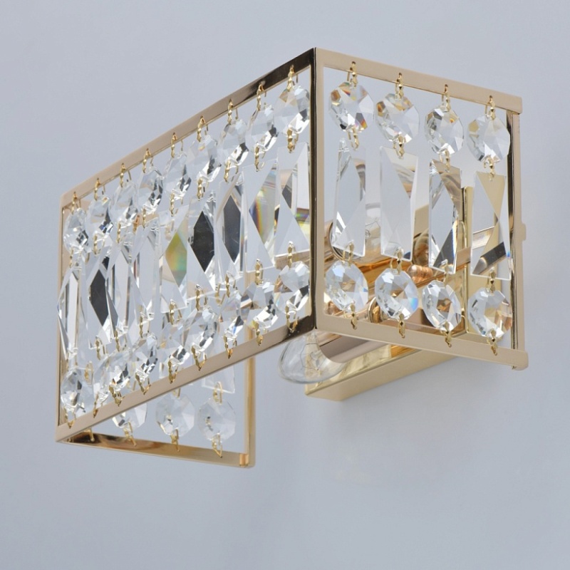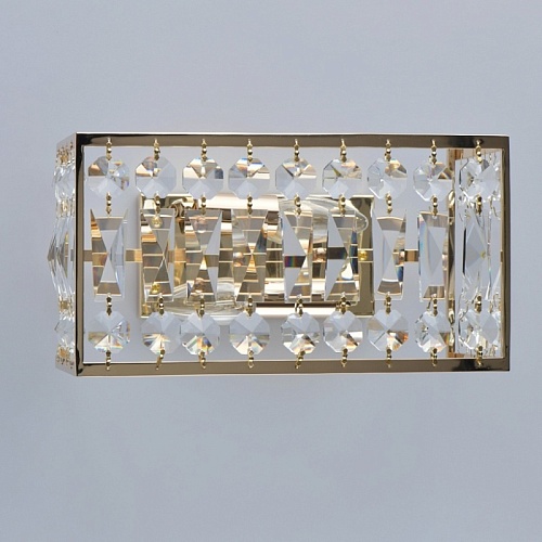 Основание бра выполнено из металла и гальванизировано в цвет французского золота. Светильник декорирован прозрачным хрусталем формы октагон и призма.