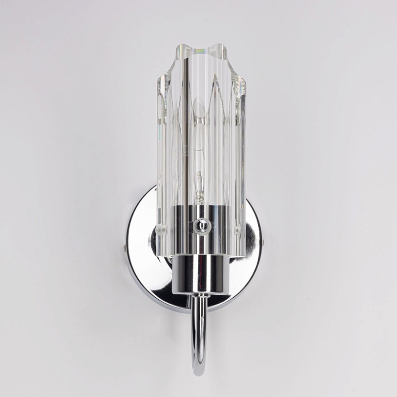 Металлическое основание настенного бра гальванизировано в цвет хрома. Вертикальное бра декорировано прозрачным фактурным стеклянным плафоном вытянутой формы.