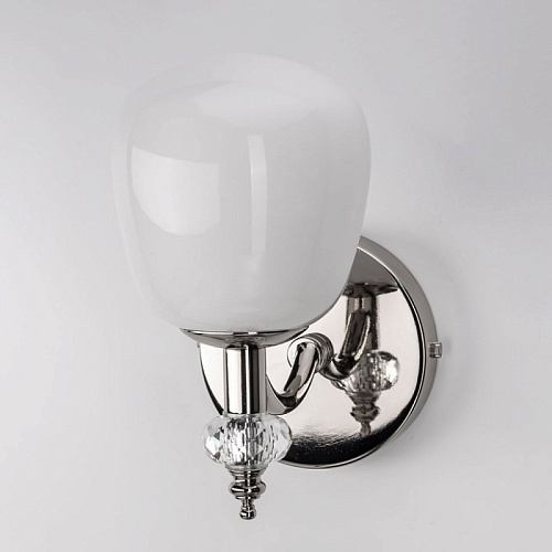 Металлическое основание бра гальванизировано в цвет хрома. Стеклянный плафон вытянутой формы окрашен в белый цвет изнутри. Настенное бра декорировано прозрачным массивом хрусталя.