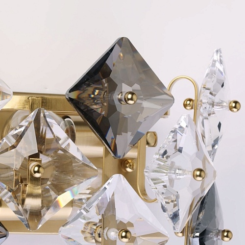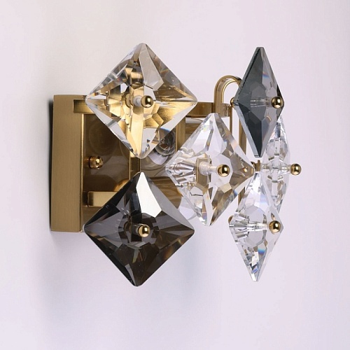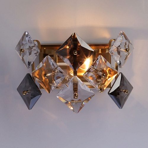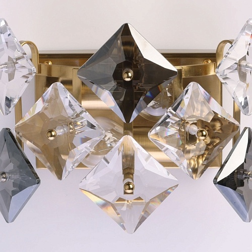 Металлическое основание настенного бра гальванизировано в цвет латуни. Горизонтальное бра декорировано прозрачным и дымчатым хрусталем квадратной формы, имитирующей природные минералы.