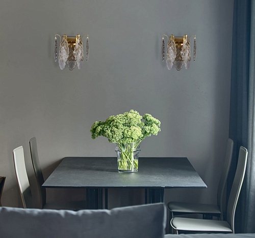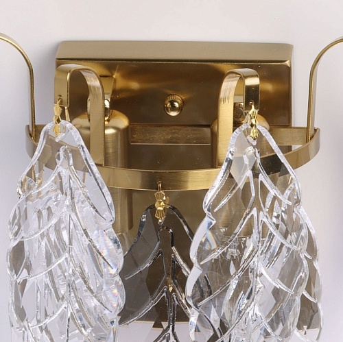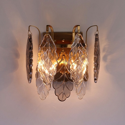 Металлическое основание настенного бра гальванизировано в цвет латуни. Бра декорировано прозрачным и дымчатым стеклом в форме дубовых листьев.