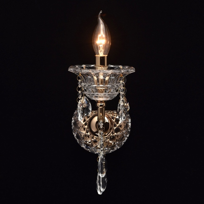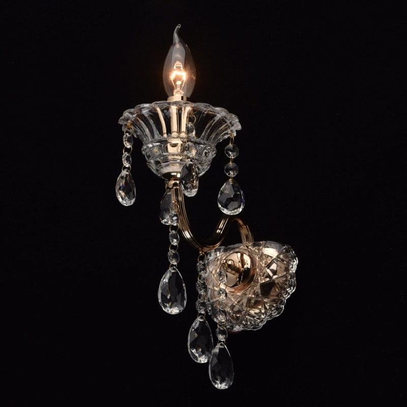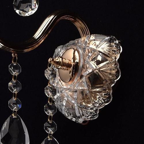Арматура бра выполнена из стали и гальванизирована в цвет французского золота. Рожок профилирован и выполнен по технологии проката на роликовом станке. Декоративные розетки выполнены из стекла, отлитого в сложную форму. Светильник декорирован подвесками из хрусталя формы октагон и миндаль.
