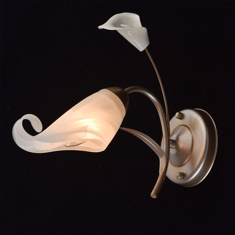 Основание: сплав металла, окраска по технологии хай-лай - основной слой цвета серебра, декоративный слой цвета золота.Декор: листья из сплава металла, технология прессования, цветы из глазурированного фарфораПлафон: гутное стекло с добавлением алебастра