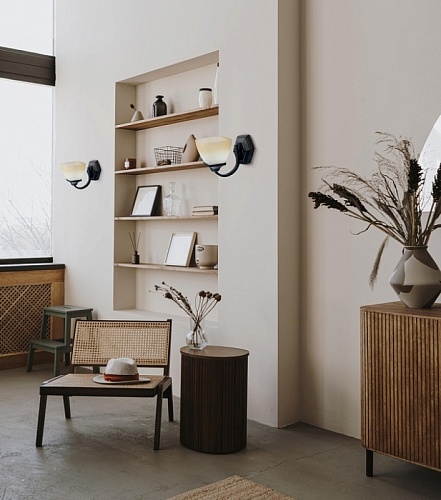 Основание светильника выполнено из металла и обработано по технологии хай-лайт, где основной слой черного цвета, а декоративный слой цвета меди. Плафон из стекла, окрашенного в массе с градуированием от белого до бежевого, отлит в форму и обработан по технологии пескоструйного матирования. Сверху на плафон вручную нанесен хаотичный рисунок белого цвета