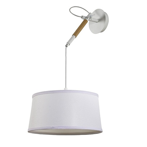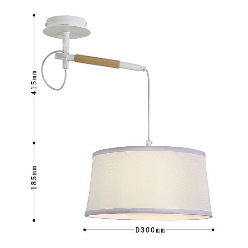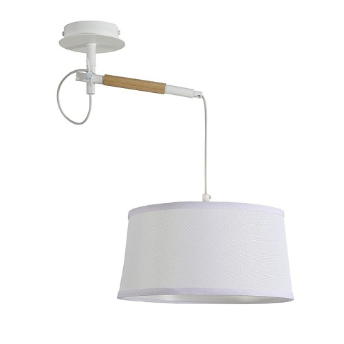 Металлический каркас белого цвета со вставкой под цвет дерева, плафон из кремовой ткани, светильник можно монтировать как на потолок, так и на стену.