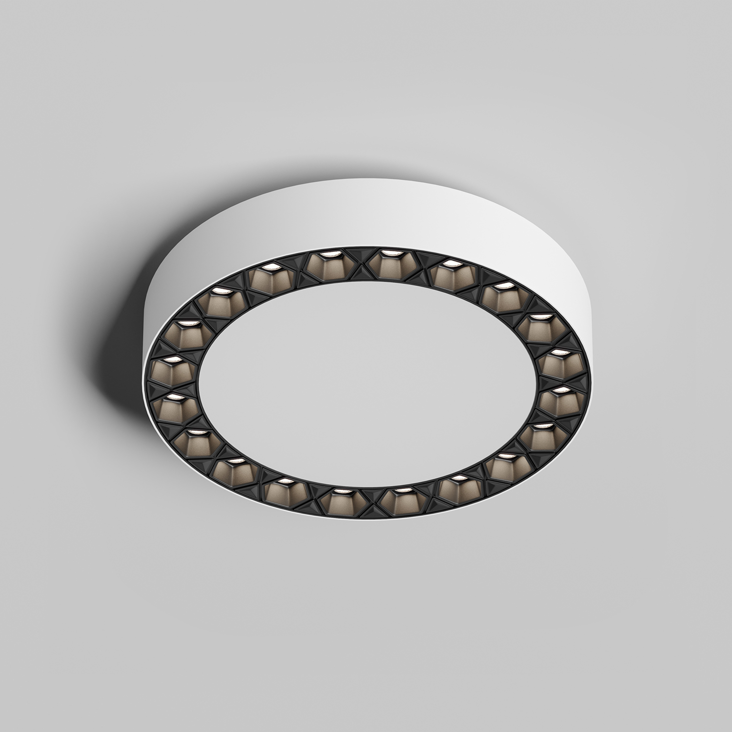 Dual - серия накладных потолочных светильников для основного освещения. Светильники данной серии имеют 2 зоны освещения:\n - центральная область, светодиоды которой расположены за рассеивателем из матового акрила;\n - радиальная область, светодиоды которой расположены по краям светильника в шестиугольных сотах.\nМожет применяться как в коммерческих помещениях, так и в жилых. Конструкция линзы в форме шестиугольника с антибликовым покрытием создает максимальный антибликовый эффект. Светильники данной серии имеют очень легкую систему установки.\nДрайвер светильника оснащен пошаговым блоком управления. Это устройство позволяет менять режимы работы светильника путем его включения и выключения при помощи обычного выключателя. При первом включении всегда включается матовая центральная часть. При этом, если повторно включить и выключить светильник в течении 10 секунд, произойдет смена режима - загорятся светодиоды по периметру, а затем, при повторном выключении и включении в течении 10 секунд, начнут светиться оба блока светодиодов в центре и по периметру. Включение с интервалом более 10 секунд всегда включает светильник в режиме свечения центральной части. Срок гарантии 3 года.