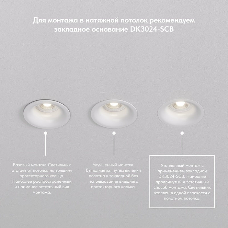 Серия встраиваемых неповоротных светильников под сменную лампу из термостойкого полимера. Корпус изделия не выступает над поверхностью, благодаря этому вариант в белом исполнении сливается с потолком. Корпус из термополимера не выцветает и не меняет цвет со временем. Утопленный источник света обеспечивает высокий уровень зрительного комфорта и исключает слепящий эффект. Светильники из полимера используются только со светодиодными источниками света. Лампа в комплект не входит. Для данной серии рекомендуем ультратонкие модули SLIM LED в качестве источника света, монтажная глубина всего 52 мм.Светильник предназначен для использования со светодиодной лампой. Установка ламп другого типа не допускается