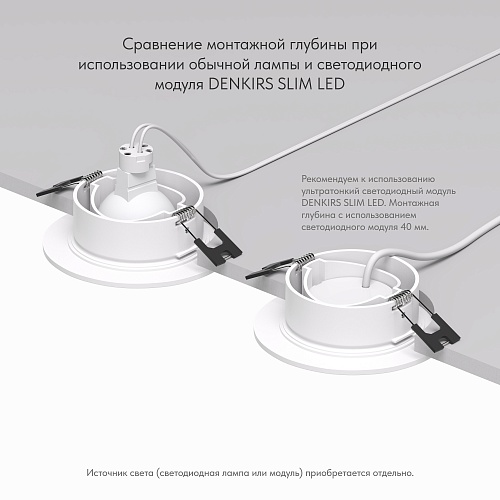 Светильники выполнены из современного термопластика.\nНизкая теплопроводность защищает потолок от нагревания. Идеальный вариант для натяжных и деревянных потолков.\nВыдерживают температуру до 120 градусов Цельсия.\nХарактерные особенности: прочность и полное отсутствие коррозии.\nЛегко моется водой.\nСветильник предназначен для использования со светодиодной лампой. \nУстановка ламп другого типа не допускается.\n\nГлубина встраиваемой части с лампой GU5.3 (патрон входит в комплект): 64 мм. Высота лампы 50 мм. \nГлубина встраиваемой части с лампой GU10 (патрон приобретается отдельно): 68 мм. Высота лампы 54 мм.\nГлубина встраиваемой части с модулем DK3000-5W, DK3000-7W dim, DK4000-5W или DK4000-7W dim: 40мм. Срок гарантии 3 года.
