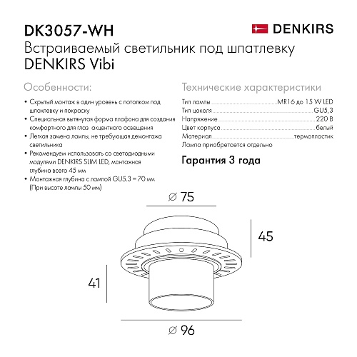Характеристики DK3057-WH Встраиваемый светильник под шпатлевку, IP20, до 15 Вт, LED, GU5,3, белый, пластик