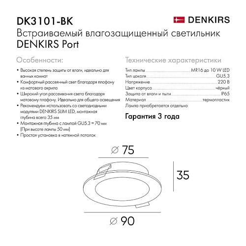 Характеристики DK3101-BK Встраиваемый влагозащищенный светильник, IP65, до 10 Вт, LED, GU5,3, черный