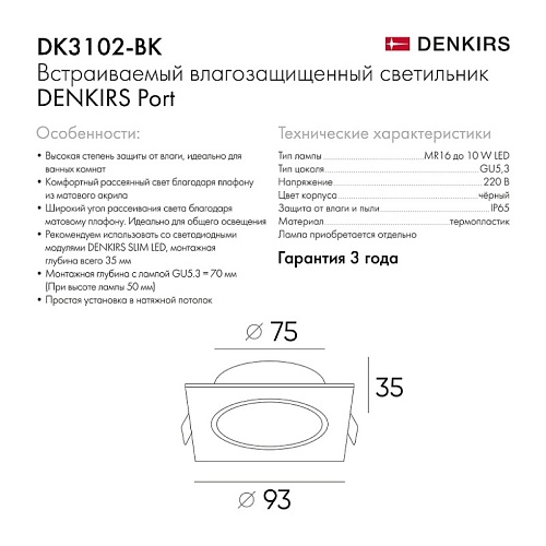 Характеристики DK3102-BK Встраиваемый влагозащищенный светильник, IP65, до 10 Вт, LED, GU5,3, черный