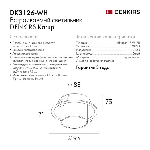 Характеристики DK3126-WH Встраиваемый светильник, IP20, до 15 Вт, LED, GU5,3, белый, пластик