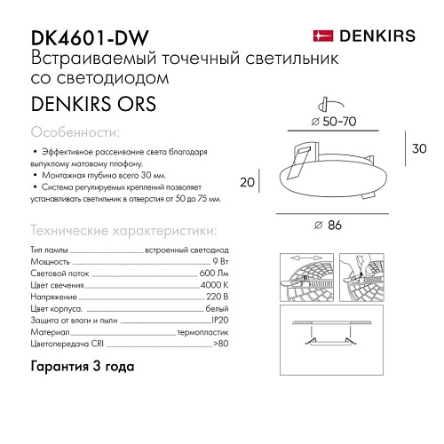Характеристики DK4601-DW Встраиваемый светильник, IP 20, 9 Вт, LED 4000, белый, пластик