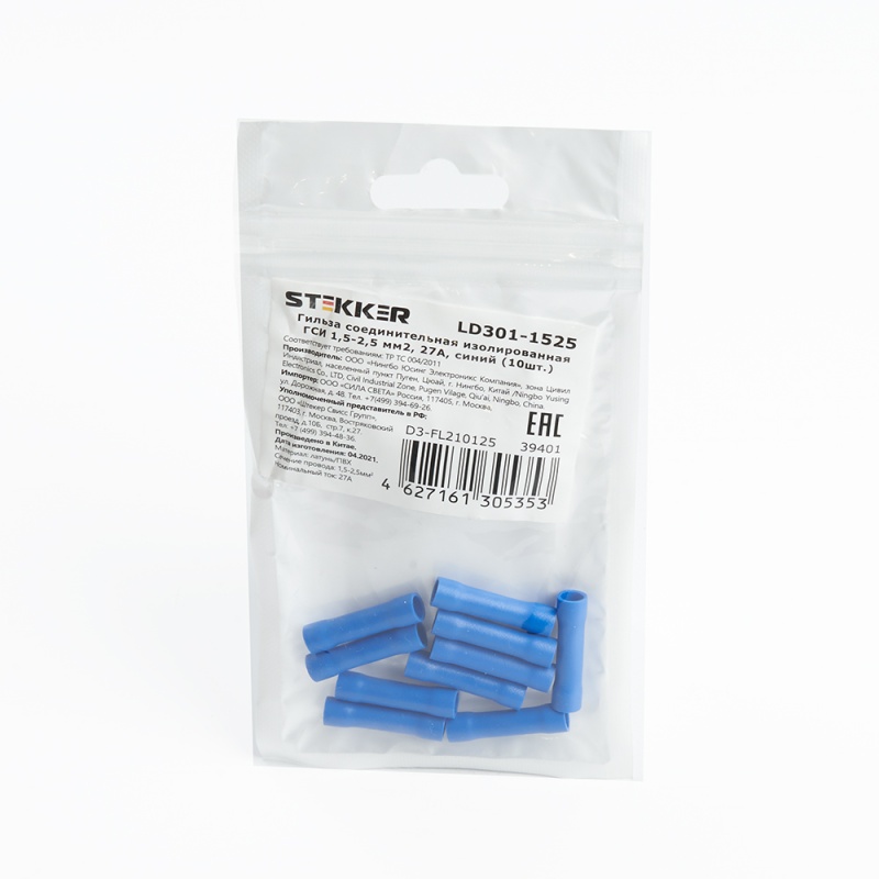 Характеристики Гильза соединительная изолированная STEKKER LD301-1525 сечение 1,5-2,5 мм2, 27A, синий (DIY упаковка 10 шт)