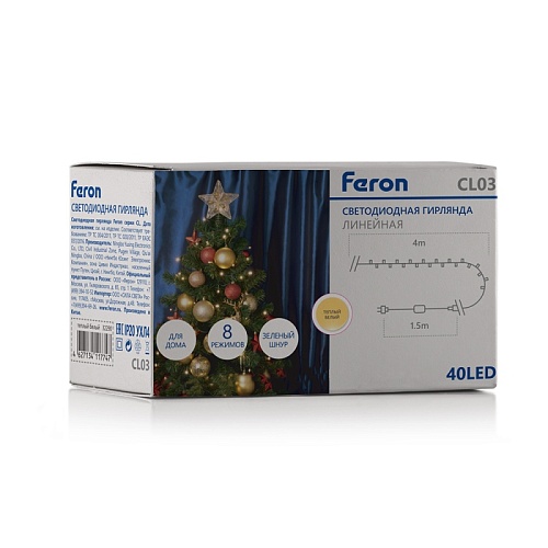 Характеристики Светодиодная гирлянда Feron CL03 линейная 4м +1.5м 230V 2700K, c питанием от сети, контроллером, зеленый шнур