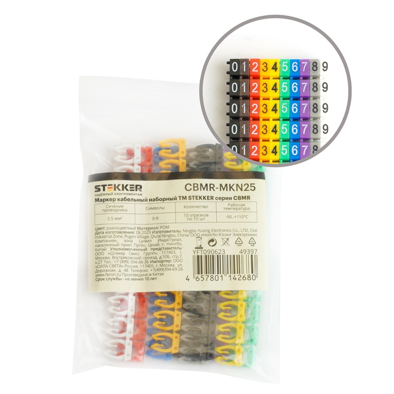 Характеристики Маркер кабельный наборный "0-9" STEKKER 2,5 мм2 CBMR-MKN25 (100шт/упак - 10 отрез. по 10 шт.)