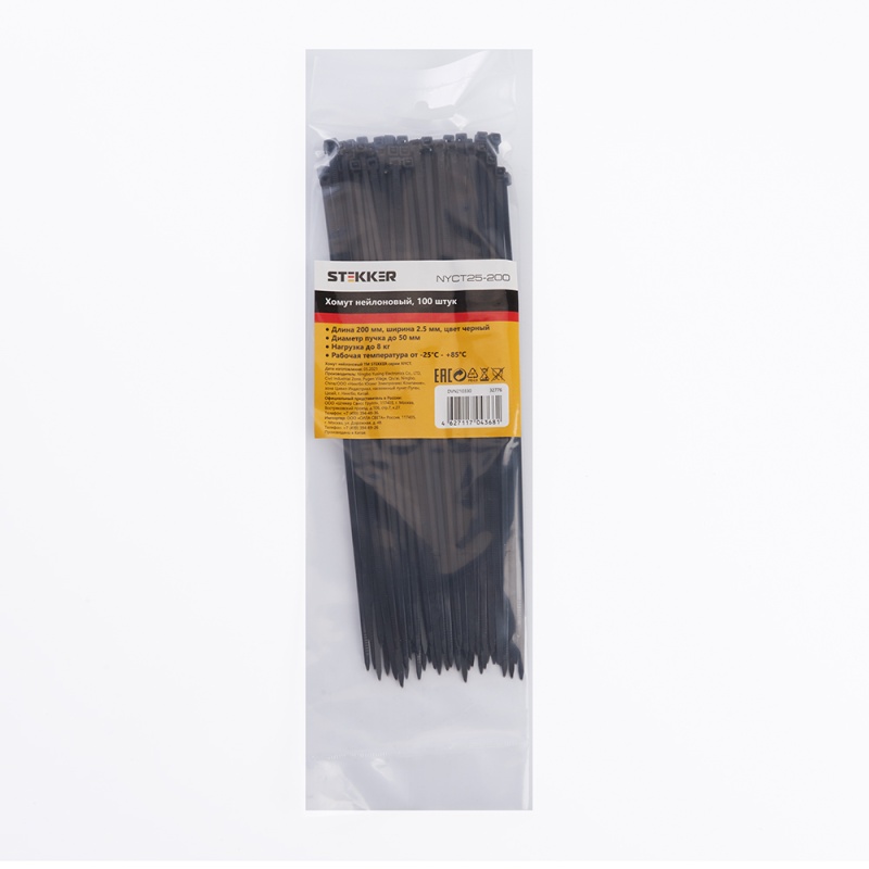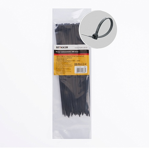 Характеристики Хомут нейлоновый STEKKER NYCT25-200 2,5x200 мм, d пучка max 50 мм, нагрузка 8 кг, белый, упаковка 100 шт