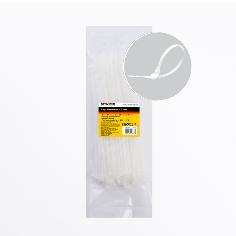 Отзывы о Хомут нейлоновый STEKKER NYCT36-200 3,6x200 мм, d пучка max 50 мм, нагрузка 18 кг, белый, упаковка 100 шт
